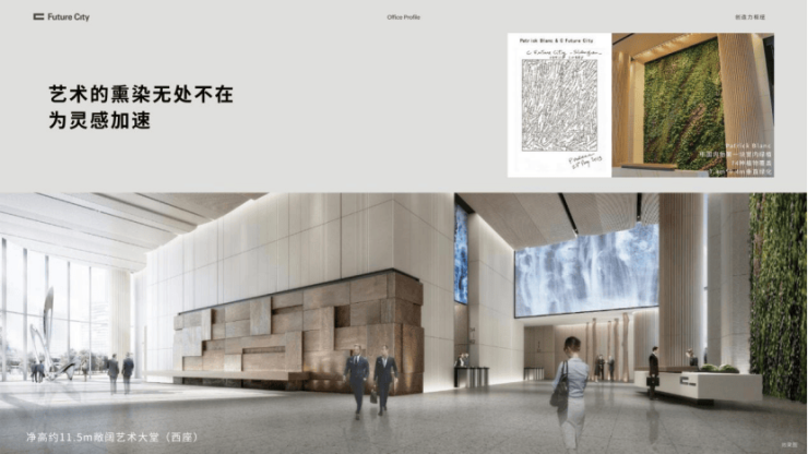 大堂: 11.5米挑高大堂,70种植物覆盖垂直绿化,配置埃利亚松艺术作品,会呼吸的商务体验。