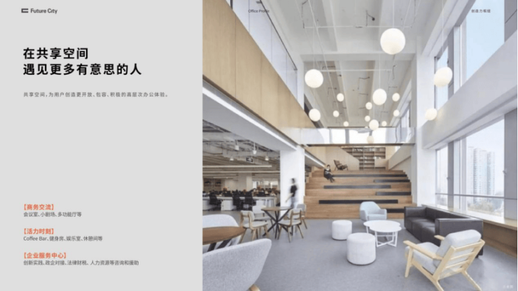 中洲旗下最高能级的共享空间,提供未来办公更灵活、更多样的场景,打造企业服务中心、高端行政酒廊、会议室、多功能厅、小型发布厅、灵活办公、健身及休闲等多重功能场所,满足入驻企业商务洽谈、社交活动等需求,创造城市办公空间更大的价值生态可持续。