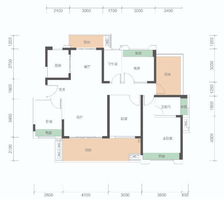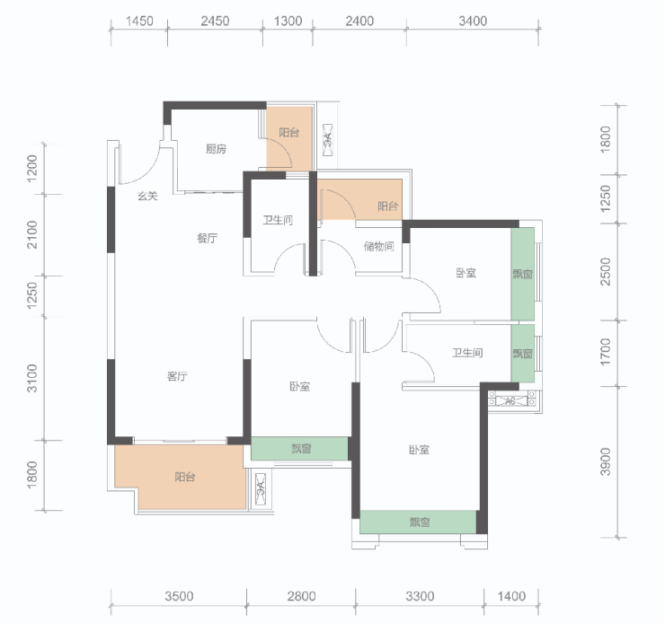 B户型: 100㎡(3+1房,2卫)同级面积稀缺3+1房、稀缺三开间朝南,