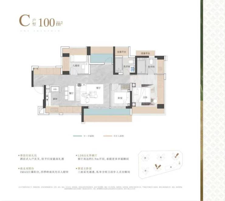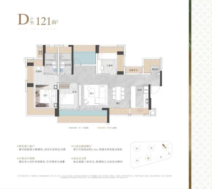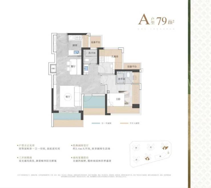 实际使用率(含赠送)在95%左右,相比建筑老规设计,得房率高了10%。79㎡就能做到三房二卫,89㎡能做到四房二卫,99-119㎡四房二卫。