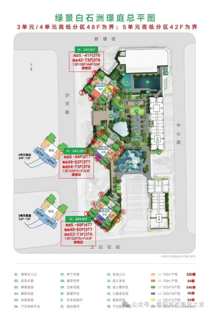 绿景璟庭属于一期,由6座建筑组成,包含3栋住宅、2栋公寓。1栋1/2单元为26/59层塔楼商务公寓,1栋3/4/5单元为74层塔楼住宅。 住宅共计1257户,公寓共计1489户。其中1-1栋公寓453套、1-2栋公寓1036套,1-3栋住宅430套、1-4栋住宅441套、1-5栋住宅386套。