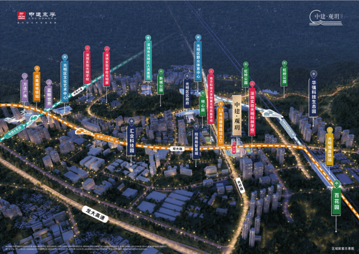 中建观玥坐落于光明区政府东南侧,光侨路与观光路交汇处,邻近地铁13号线德雅路站,除了有全区TOP级的市政配套,还有稀缺的生态资源。