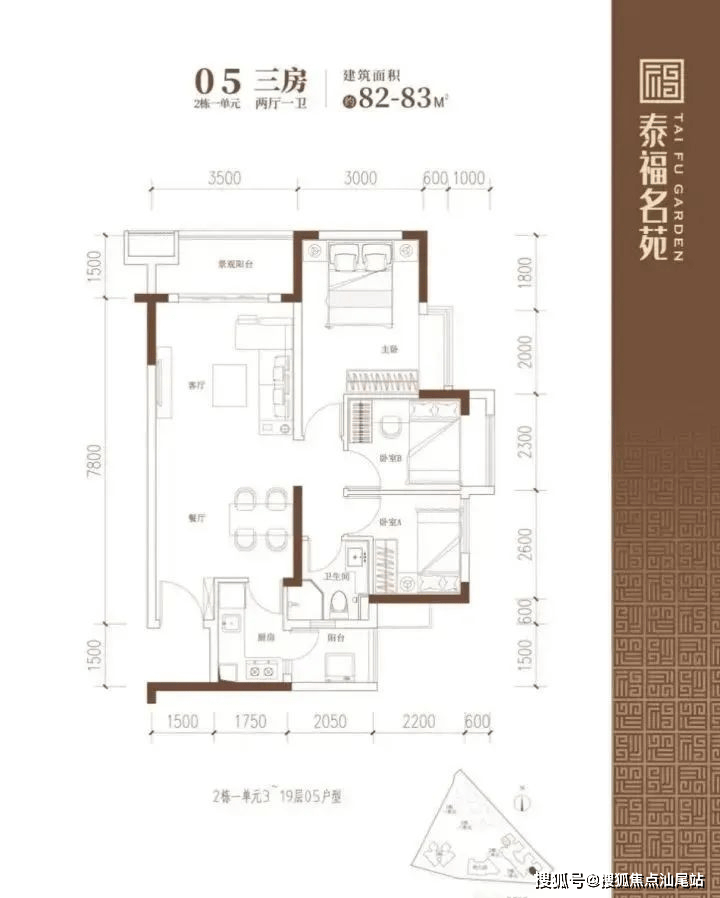建面约82-83㎡的3房2厅1卫户型,在保证空间尺度感的前提下做到3个房间,实用性高