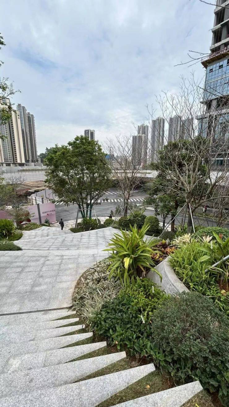 连廊的好处是可以省去业主通往周边(商业、公园等)的很多麻烦,不需要自驾,不受地面交通影响,站在廊桥看风景别有一番滋味,且廊桥本身也是城市的一道风景(下图是站在廊桥看一楼地面、公园和商业)。
