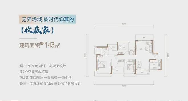 143㎡的5房2厅2卫,设计的是横厅南北通透格局,进门独立玄关,客餐厅一体化,客厅连接厨房出大阳台,16.8米超宽视野,豪华主卧套间,二字型厨房。