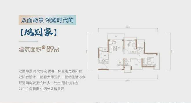 89㎡的3房2厅2卫(南北通),设计的是竖厅南北通透格局,客餐厅一体化,全屋飘窗设计,有1个房间是半赠送面积,L型厨房。