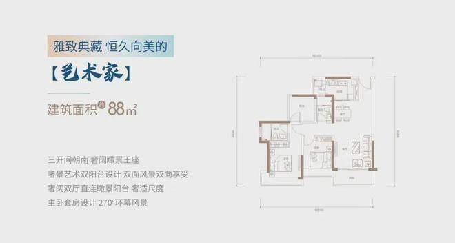 88㎡的3房2厅2卫(竖厅),设计的是竖厅格局,客餐厅一体化设计,三开间朝南,有1个房间是半赠送面积,L型厨房,阳台有西南、东南、正南朝向。