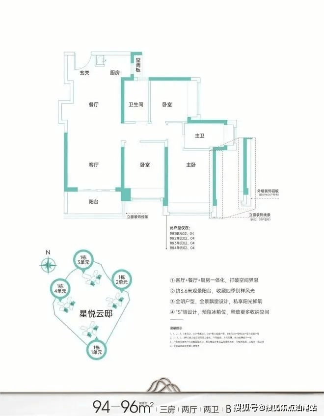 94-96㎡三房两厅两卫:经典竖厅格局,客厅3.6米开间,客餐厨一体化设计,三开间朝南,U型厨房。