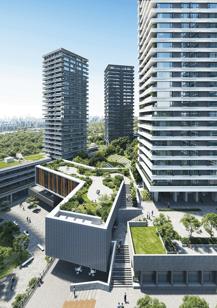 以“方塔”布局和“多个地面”台地系统为特色,最大化的将公共空间与自然生态相融合,建筑颜值与居住品质双在线。