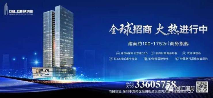 创汇国际中心项目坐落于深圳市龙岗区坂田街道坂雪岗大道和永香路交汇处,是片区内唯一130米甲级写字楼,总建面约7.9万㎡,其中办公体量约4.4万㎡,商业体量约3.5万㎡。写字楼共31层,其中1-4层为商业,5-31层为办公,产品面积100m²-1752m²,灵活组合,可满足不同发展阶段企业办公需求,项目致力于打造坂田片区高端商务项目,吸引国内外大型企业总部及各大行业企业进驻。创汇国际中心大厦写字楼招租电话:400-088-3336(写字楼招租)