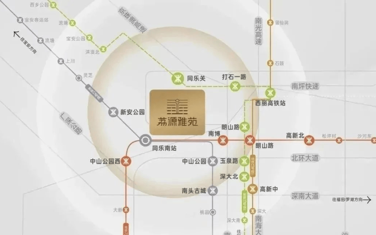 项目周边聚集深圳头部产业资源:西侧为科技园(腾讯、大疆等科技企业总部),东接前海金融中心,南靠蛇口自贸区,北邻留仙洞战略性新兴产业总部基地。区域内以高新技术、金融、总部经济为主导,吸引大量科技从业者及金融精英,形成高净值人群聚集效应。同乐片区未来或承接南山产业外溢,成为职住平衡的重要节点。