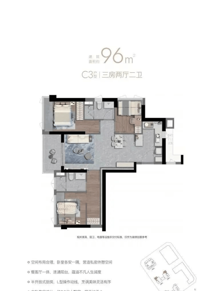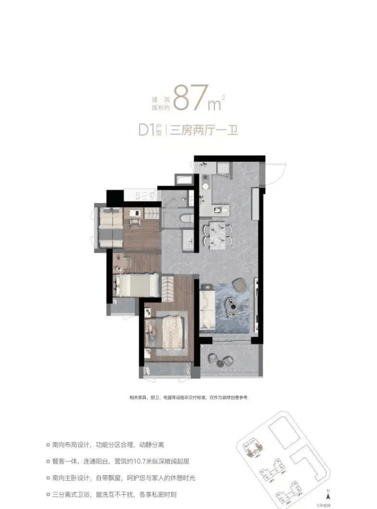3、实用率低:非新规产品且为超高层,实用率远低于新规产品,例如 87㎡三房仅配置一卫。