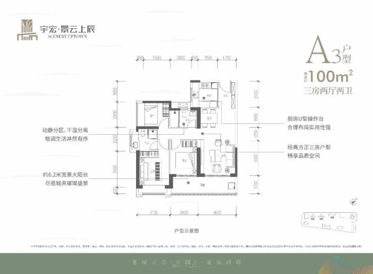 100㎡的3房2厅2卫,设计的是竖厅格局,客厅3.6米开间,LDKB一体化,三开间朝南,3个卧室分别做到了3.1米/2.6米/2.4米的宽度,客厅连接次卧出6.2米长的大阳台,U型厨房,卫生间干湿分离,得房率约76%(不含赠送),东南朝向。