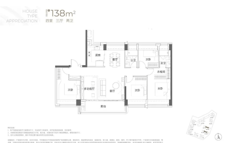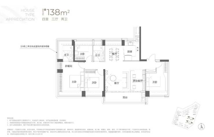 138㎡的4房2厅2卫:竖厅南北通透格局,专梯入户,客厅6.1米开间,LDKB一体化,全屋飘窗,4个卧室分别做到了3.9米/3.25米/2.9米/2.8米的宽度,主卧加1个次卧270°全景飘窗,客厅出6.1米长的大阳台,U型厨房,得房率约95-97%(包含赠送),阳台主朝西南向。138平米户型分布在3栋1单元、3栋2单元、4栋1单元、4栋2单,4个单元纯大户型。