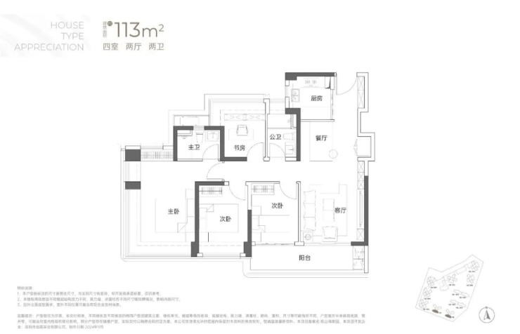 建面113平米:4房2厅2卫,传统的竖厅户型动静分区,‘S’型墙体,有冰箱预留位;市面非常常见的竖厅4房户型,比较突出的是有大阳台连接客厅和次卧;主卧和书房(卧室)都是多飘窗设计,保证了视野和多方面的采光;这种户型的缺点是走廊过长,空间利用率比横厅或者双龙抱珠户型差些;户型分布在5栋、6栋03/04户型,均是西南朝向,看小区外面大南山方向,比较安静;