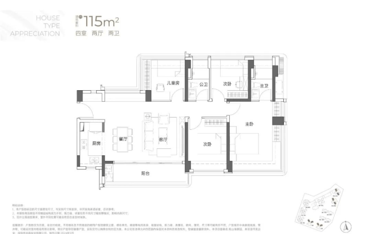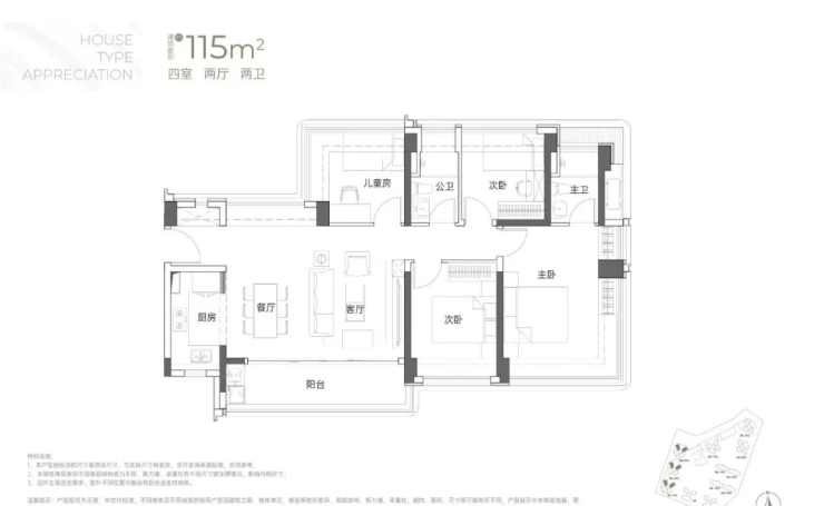 115㎡的4房2厅2卫:横厅南北通透格局,客餐厅6米开间,LDKB一体化,全屋飘窗,4个卧室分别做到了3.9米/3米/2.8米/2.6米的宽度,主卧加1个次卧270°全景飘窗,客厅出6米长的大阳台,L型厨房,得房率约95-97%(包含赠送),西南或东南朝向。115平米户型分布在1栋1单元、1栋2单元、1栋3单元01/02户型,01户型西南朝向都是看小区外围,02户型看向小区;