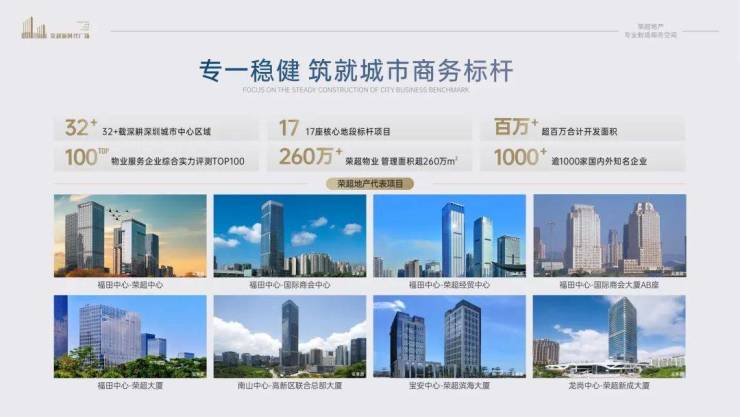 🏙【品质保障 鹭湖唯一专业商务空间开发商】荣超集团——创立于1993年,31年开发运营经验,专注于核心区高端写字楼开发运营,是最早进入福田CBD的专业写字楼开发商荣超物业——国家一级物业管理资质,写字楼物业管理标杆企业,管理面积超260万㎡,荣获“物业服务企业综合实力测评TOP100”、“深圳物业服务企业综合实力百强”