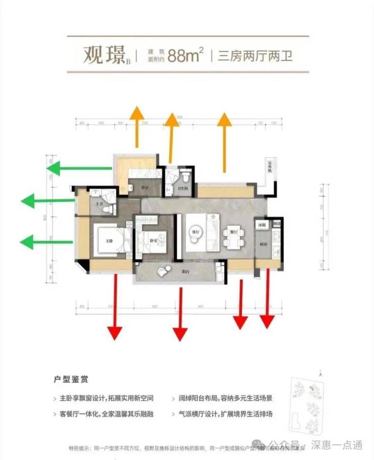 再来看一下0506的88㎡这里两个户型是一模一样,唯一区别就是绿色箭头房间朝向一个朝马路一个朝花园,0506也是2栋的户型最好东南朝向,同时景观视野还不错看学校