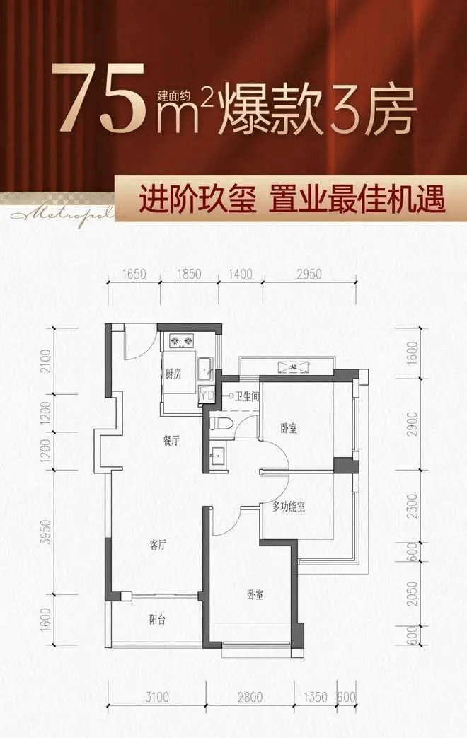75㎡的3房2厅1卫,设计的是竖厅格局,客厅3.1米开间,LDKB一体化,S墙设计预留冰箱卡槽位,3个卧室分别做到了主卧10.2㎡/次卧8.55㎡/次卧7.95㎡(包含墙体飘窗),U型厨房,卫生间三段式分离,得房率约77%(不含赠送),西南朝向。