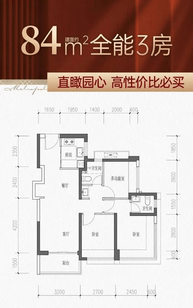 84㎡的3房2厅2卫,设计的是经典竖厅格局,客厅3.2米开间,LDKB一体化,S墙设计预留冰箱卡槽位,三开间朝南,3个卧室分别做到了主卧12.37㎡/次卧9.18㎡/次卧6.76㎡(包含墙体飘窗),U型厨房,卫生间三段式分离,得房率约77%(不含赠送),西南或东南朝向。