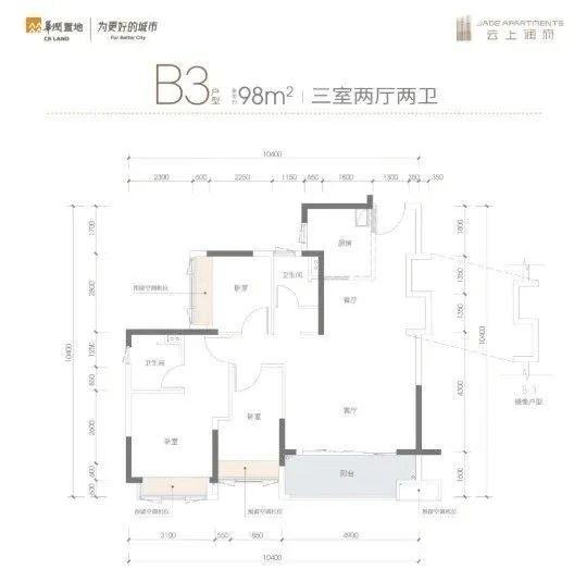 B2户型:经典竖厅格局,客厅3.45米开间,连接6.2米长的大阳台,得房率83.76%,西南、东南或西北向。