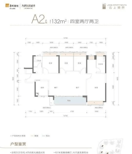 A2户型:横厅南北通透格局,客餐厅6.1米开间,主卧大套房设计,得房率82.83%,阳台主朝东南向。