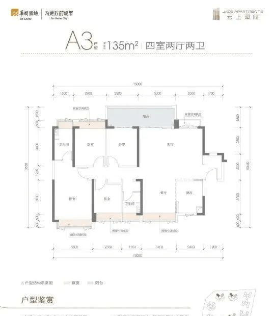 A3户型:竖厅超大宽厅格局,客厅5.8米开间,连接6.1米长的大阳台,主卧大套房设计,得房率83.65%,阳台主朝东北或西北向。