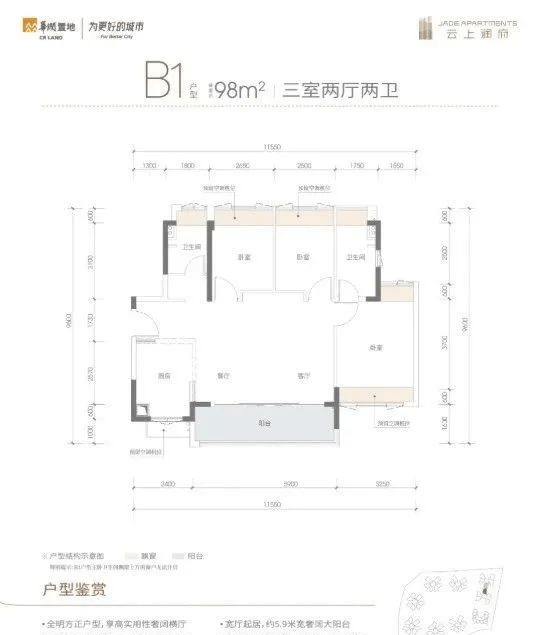 B1户型:横厅南北通透格局,客餐厅5.9米开间,得房率81.23%,阳台主朝东南向。