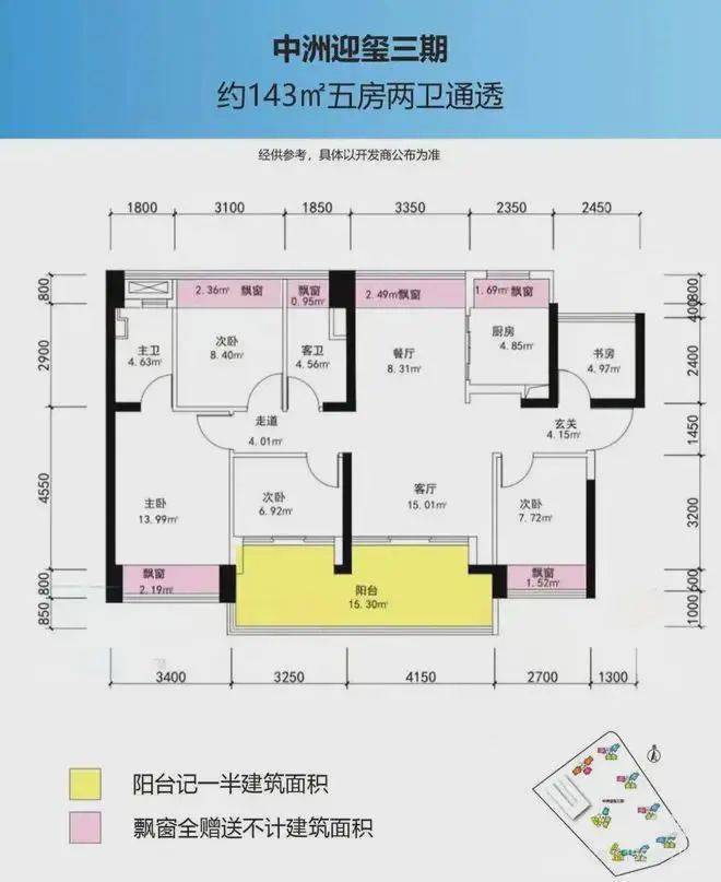 143㎡的5房2厅2卫,设计的是竖厅南北通透格局,进门入户玄关,客厅4.15米开间,LDKB一体化设计,四开间朝南,5个卧室分别做到了主卧16.18㎡/次卧10.76㎡/次卧7.72㎡/次卧6.92㎡/次卧4.97㎡(包含墙体飘窗),客厅连接次卧出7.4米长的大阳台,U型厨房,卫生间干湿分离,赠送面积高达18.85㎡,阳台主朝正南向。