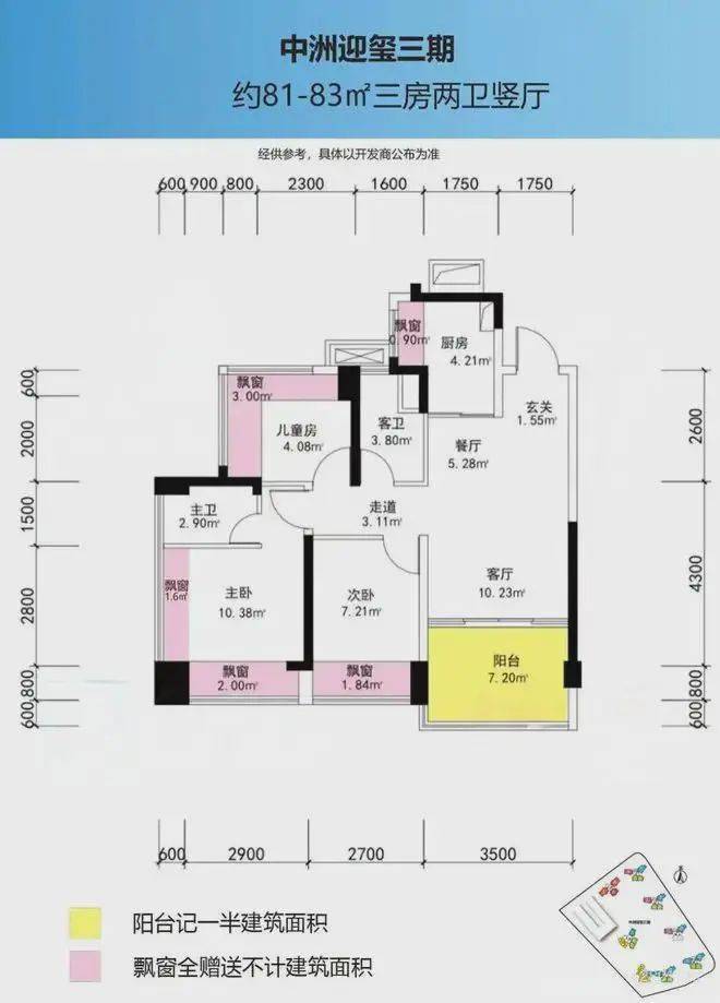 83㎡的3房2厅2卫,设计的是经典竖厅格局,进门入户玄关,客厅3.5米开间,LDKB一体化设计,3个卧室分别做到了主卧13.98㎡/次卧9.05㎡/次卧7.08㎡(包含墙体飘窗),L型厨房,卫生间干湿分离,赠送面积高达12.94㎡,西南、正南或西北朝向。