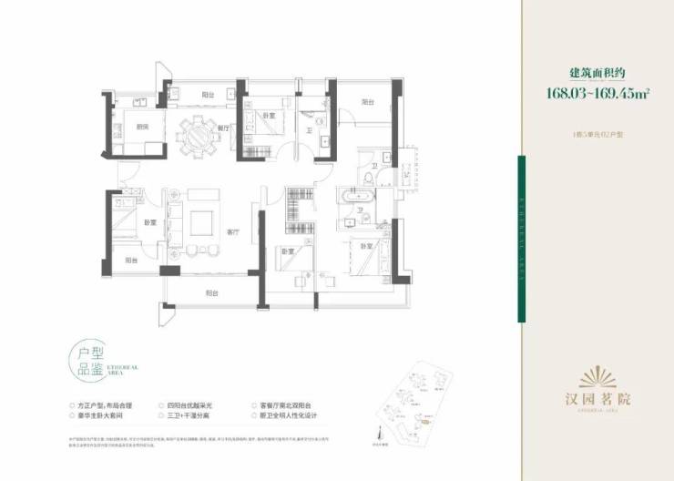 目户型方正、布局合理,动静分区,其中168㎡五房户型为四阳台设计,客餐厅南北通透双阳台,豪华主卧大套房。