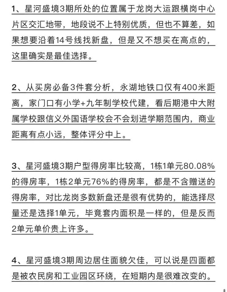 星河盛境3期,总占地面积约3.7万㎡,总建筑面积约26万㎡,分两个地块开发,总规划1466户。星河盛境3期于2023年11月30日取证入市,推出1栋1单元,总层高33层,2梯6户,1栋2单元,总层高49层,3梯6户,共467套房源。有83-87平3房2厅2卫,94-96平3房2厅2卫,106-113平4房2厅2卫。总价折后290万,单价3.3万,带精装修交付,合同26年2-3月份交付,工程进度快可以在25年底之前交付。