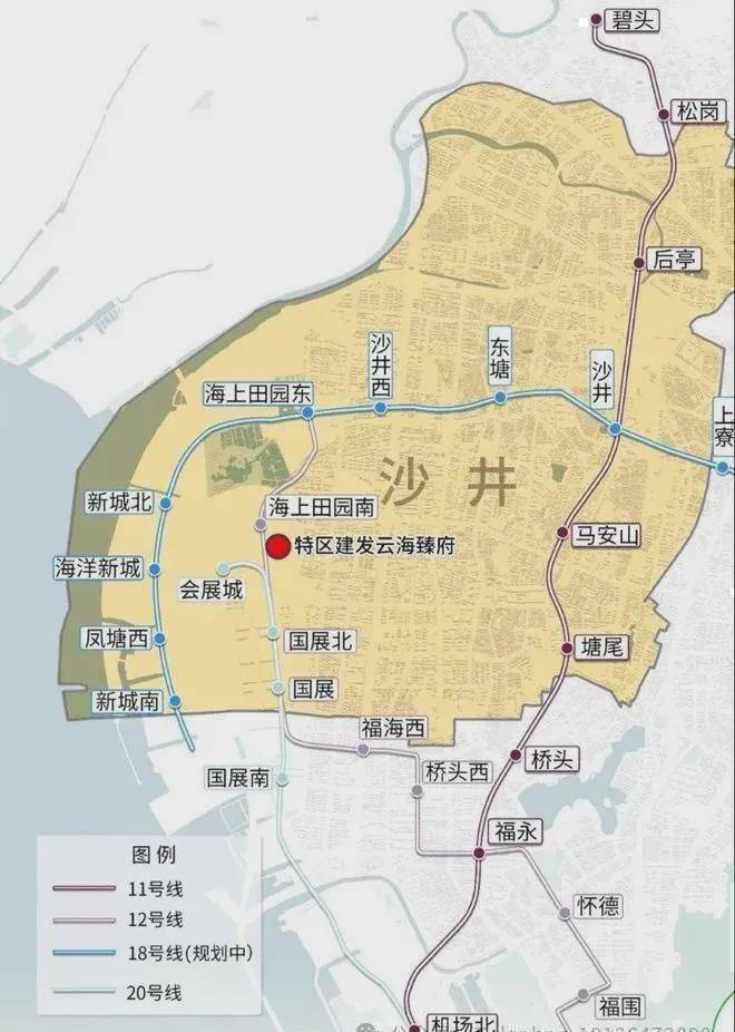 距离即将开通的12号线海上田园南站约260米,号称换乘之王的12号线通达宝安西乡、南山传统中心区、蛇口自贸区等区域;距离开通的20号线会展城站约720米,20号线二期(规划中)将作为一期工程的南延段,从宝安西乡过南山传统中心区。