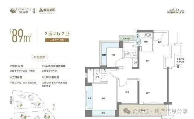 89㎡的3房2厅2卫,设计的是经典竖厅格局,客厅3.154米开间,客餐厅约18.8㎡,LDKB一体化,S墙设计预留冰箱卡槽位,动静分区,分别做到了主卧13.66㎡/次卧7.04㎡/次卧6.28㎡(实测面积,去掉墙体),主卧+1个次卧270°飘窗设计,U型厨房,公卫三段式分离,客厅连接卧室出7.56平的大阳台,得房率约76.2%(不含赠送),东南、西南或西北朝向。