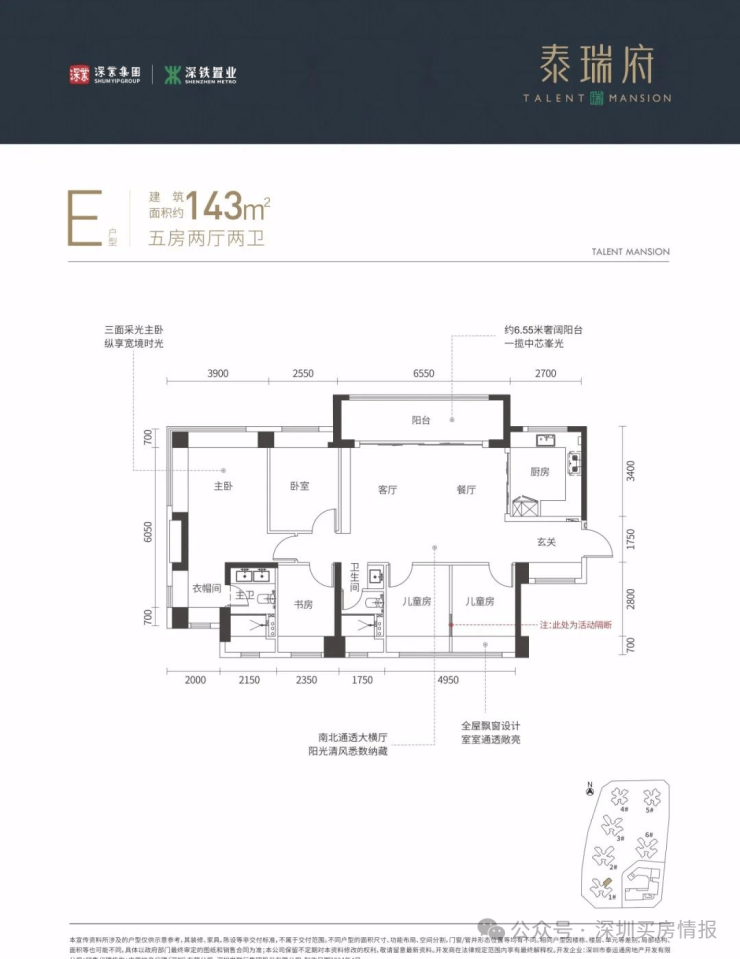 143㎡的5房2厅2卫,设计的是横厅南北通透格局,进门入户玄关,客餐厅6.55米开间,四开间朝南,5个卧室分别做的3.9米/2.55米/2.48米/2.47米/2.35米/的宽度,U型厨房,公卫三段式分离,得房率:77.48%(不含赠送),阳台主朝东南或西南向。
