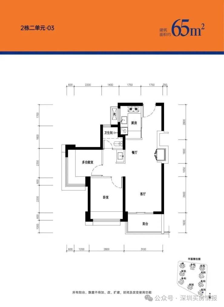65㎡的2房2厅1卫,设计的是竖厅格局,LDKB一体化,客厅3.1米开间,S墙设计预留冰箱卡槽位,2个卧室分别为2.8/2.35米的宽度,U型厨房,得房率:77.27%(不含赠送),阳台进深1.6米,东北朝向。