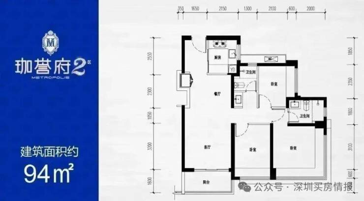 94㎡的3房2厅2卫,设计的是竖厅格局,动静分区,客厅3.4米开间,S墙设计预留冰箱卡槽位,3个卧室分别为3.7/2.7/2.35米的宽度,主卧270°环幕飘窗视野,U型厨房,得房率:77.54%(不含赠送),阳台进深1.6米,西南朝向。