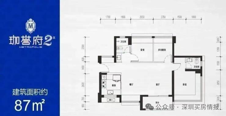 87平米,设计的是横厅南北通透格局,客餐厅6.2米开间,3个卧室分别为3.3/2.65/2.35米的宽度,主卧270°环幕飘窗视野,U型厨房,得房率:77.54%(不含赠送),阳台进深1.7米,主朝东南朝向。