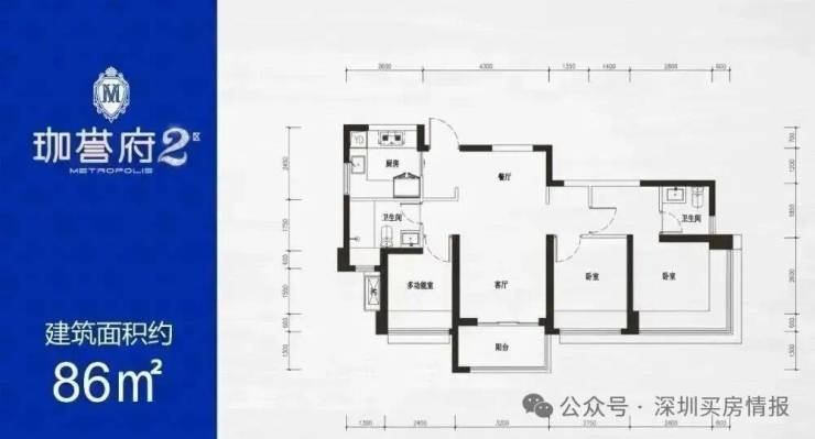 86㎡的3房2厅2卫,设计的是竖厅南北通透格局,客厅3.2米开间,3个卧室分别为3.2/2.75/2.4米的宽度,主卧270°环幕飘窗视野,U型厨房,得房率:77.54%(不含赠送),阳台进深1.3米,主朝西北、东北、东南或西南朝向。