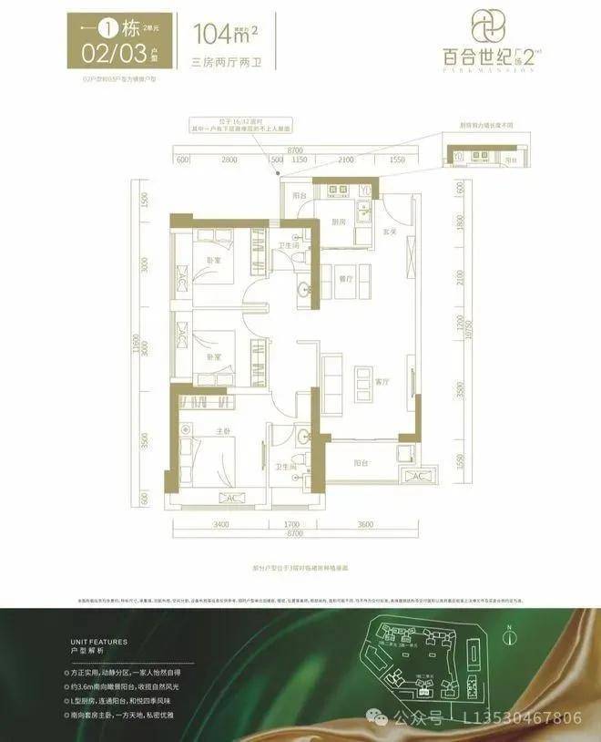 1栋02/03户型,设计的是竖厅格局,客厅3.6米开间,LDKB一体化设计,三开间朝南,动静分区,正南朝向。