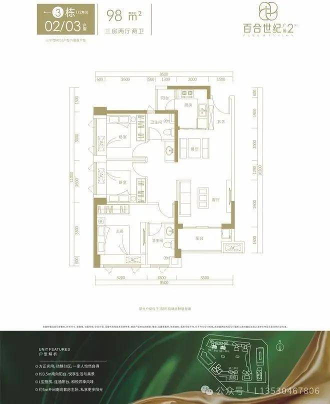 3栋02/03户型,设计的是竖厅格局,进门入户玄关客厅3.5米开间,LDKB一体化设计,三开间朝南,动静分区,正南朝向。