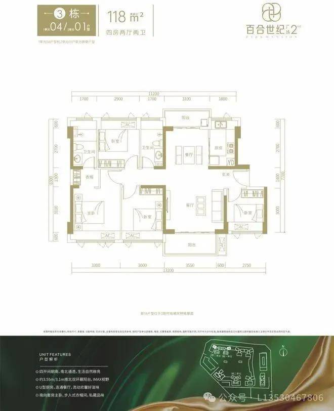 3栋1单元04/3栋2单元01户型,设计的是竖厅南北通透格局,进门入户玄关,客厅4.15米开间,客餐厅分离设计,南北双阳台,阳台主朝西南或东南向。