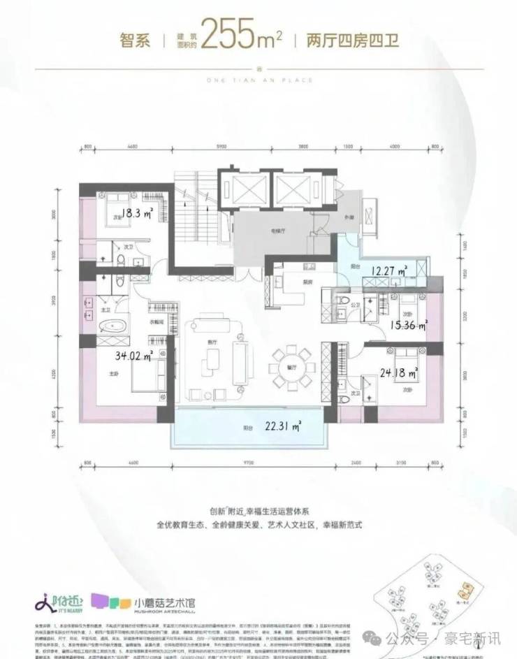 255㎡的4房2厅4卫,1栋1单元01/02户型,设计的是竖厅双龙抱珠格局,专梯入户送超大私用入户空间,客厅9.7米开间,LDKB一体化设计,主卧带大衣帽间,三套房设计,分别做到了主卧34.02㎡/次卧24.18㎡/次卧18.3㎡/次卧15.16㎡(包含墙体飘窗),客厅连接餐厅出9.7米长的大阳台约22.31平,J型厨房带1个生活阳台约12.27平,卫生间干湿分离,得房率约96.7%(包含赠送,不含入户空间),西南或东北朝向。飘窗赠送面积24.8㎡+阳台赠送17.29㎡=实际赠送42.09㎡(不含电梯入户空间)。