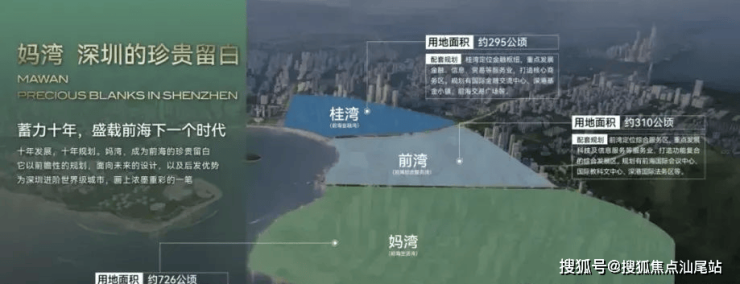妈湾拥有山海合一资源,背靠大小南山,对望腾讯科技城,生态资源丰富。面积726.5公顷,容积率1.28-1.48,是低密生态豪宅住宅区的理想选择。官方策略是先建设配套、发展人才,再建房,促进妈湾与前湾、桂湾的协调发展。