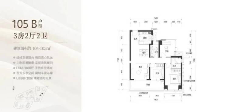 105㎡的3房2厅2卫,B户型(2栋3单元02/06户型),设计的是经典竖厅格局,客厅3.6米开间,LDKB一体化设计,三开间朝南,动静分区,3个卧室分别做到了主卧13.12㎡/次卧9.9㎡/次卧8.4㎡(包含墙体飘窗),客厅连接次卧出6.4米长的宽景大阳台,U型厨房,卫生间干湿分离,得房率约90%(包含赠送),正南或东南朝向。