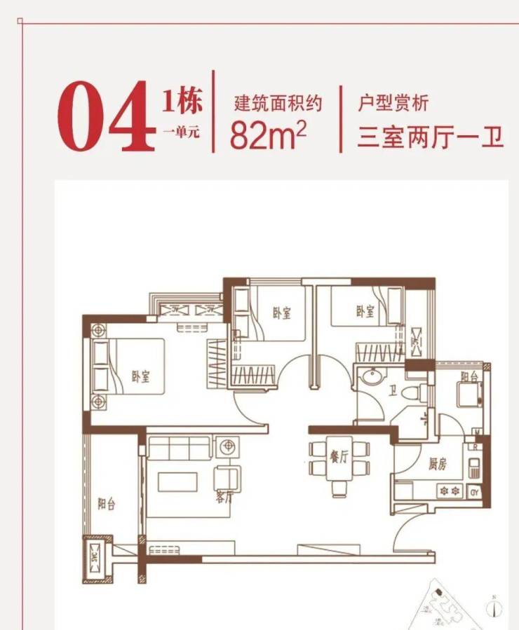 三房两厅一卫82㎡总价约330万,首付约49.5万