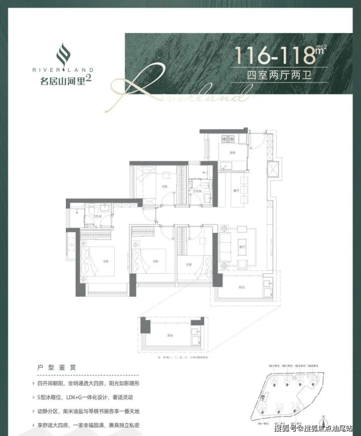 116-118平4房2厅2卫:东南朝向,不含赠送使用率在74%