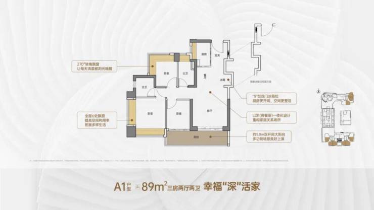 89㎡的3房2厅2卫,A2户型,设计的是竖厅格局,客厅3.5米开间,LDKB一体化,S墙设计预留冰箱卡槽位,客厅连接次卧出5.9米长的大阳台,次卧270度转角飘窗,U型厨房,卫生间干湿分离,阳台有朝西向、东向、南向。