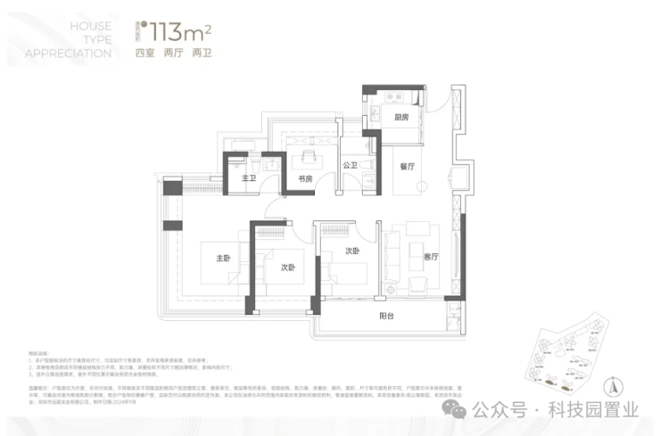 竖庭格局,西南向,基本居住功能与建面约108-110㎡4房2卫一致,但格局不一样,从目前公布的户型图上看,主要是主卧空间有了更大的提升,比如可以放更大一点的衣柜。但从位置上看,它所在的楼栋更靠近主干道,会有噪音影响。