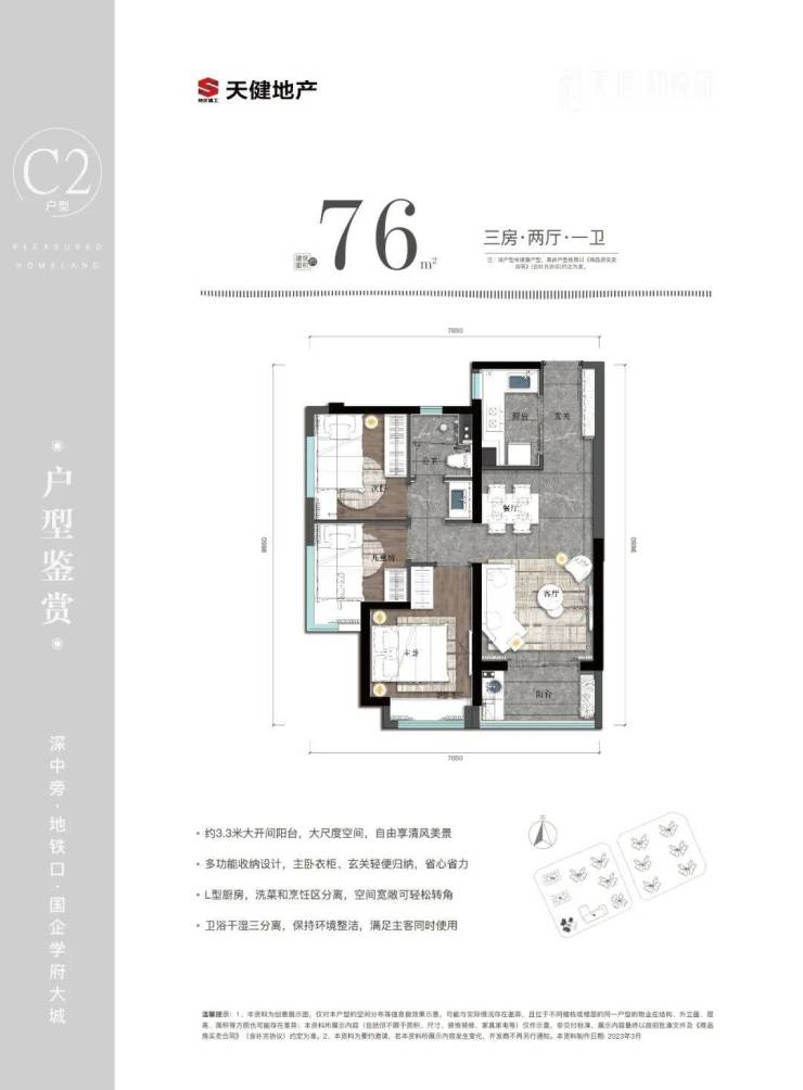 76㎡的3房2厅1卫,设计的是竖厅格局,进门入户玄关,客厅3.3米开间,L型厨房,卫生间三段式分离,得房率75.05%(不含赠送),阳台朝西北、西南或东北向。